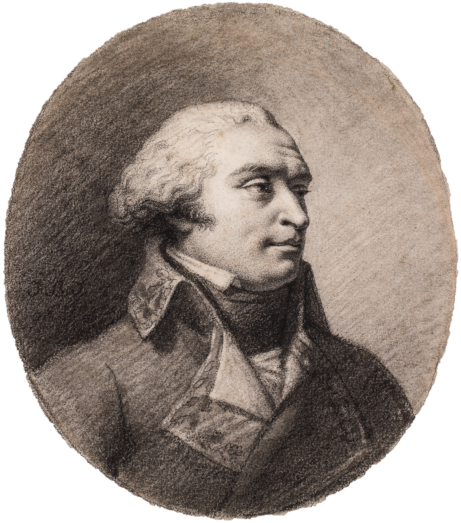 Our portrait is a terrific example of his works on paper. Critics spoke of his great mastery of light effects and drawn heads which had “life and a lot of expression.”2 Starting in the 1790s, he preferred medallion formats which were very much in fashion, as well as the monochrome grounds which let the gaze focus on the essentials. Thanks to very rigorous stippled drawing technique, our portrait renders the volumes, hair, and vest in minute detail, even while conserving a smooth appearance flattering to the whole and leaving the multiple pencil strokes barely perceptible.