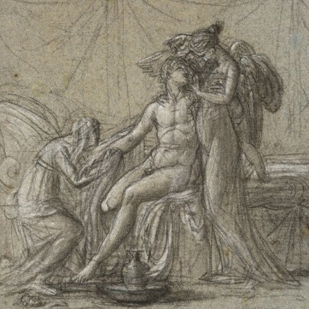 The subject, taken from Jerusalem Delivered, an epic poem written by Tasso in 1581, was to be of renewed interest throughout the 17th and 18th centuries, from Poussin to Tiepolo, via La Fosse. The moment depicted, which comes from canto XIV, is when Armida the magician prepares to kill the Christian knight Renaud while he is sleeping. Marot has not clearly drawn the dagger which she is to hold, but her momentum slowed by a cupid and her closed hand reveal the intended action: she wants to kill Renaud. However “from enemy she becomes lover,” as the text implies, and Armida finally falls in love, resigns herself to it, and finishes by leading her lover to an island. François Marot thus follows the text with a certain rigor.