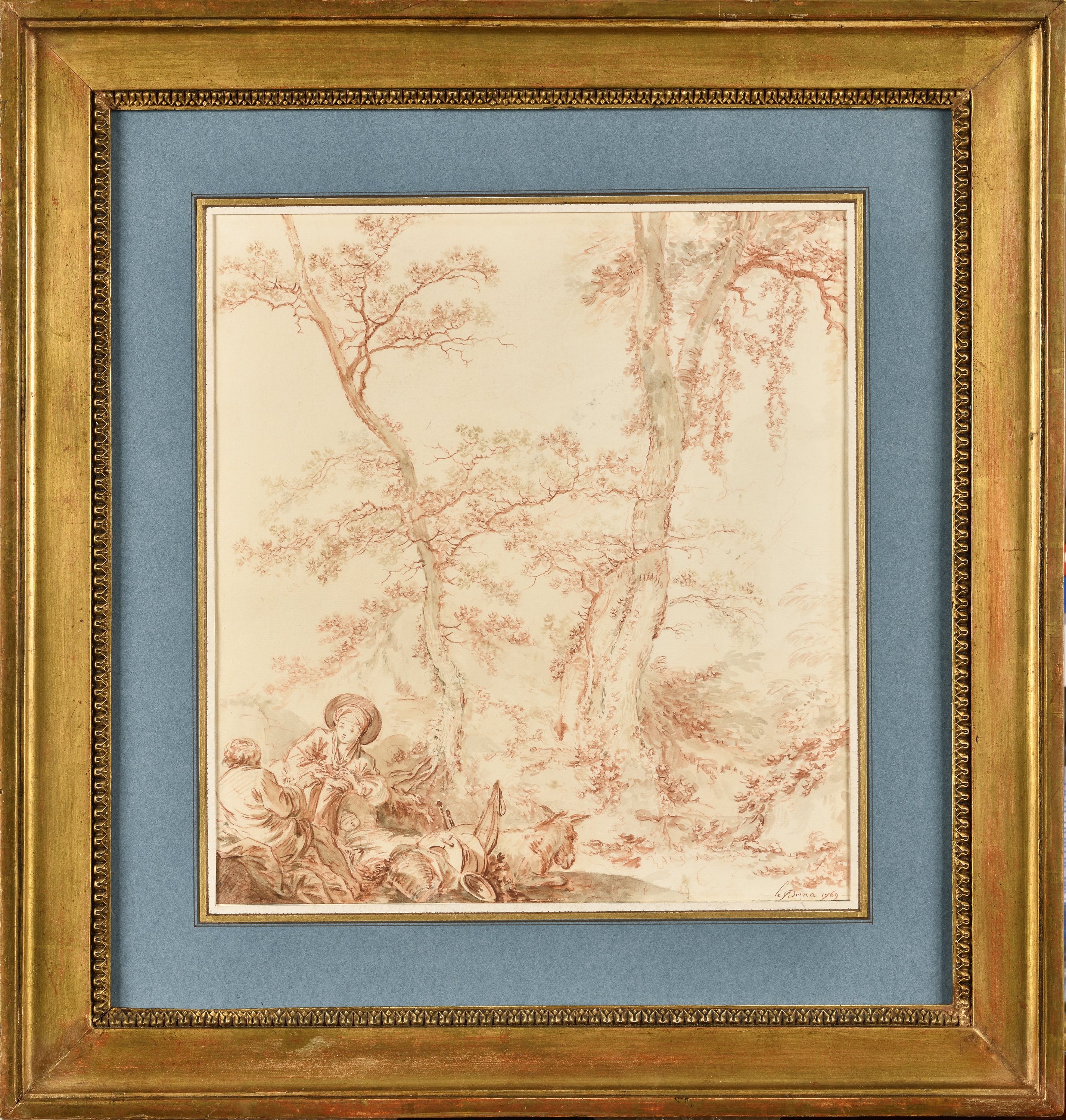 With the engraver Gilles Demarteau, specialist in facsimiles of pencil work, the artist brought out Principes du dessin dans le genre du paysage (Principles of Drawing in the Genre of Landscape). The work demonstrates the importance the artist gave to studying nature that our work also evokes, in that nature takes up most of the composition. His production reveals the influence of Dutch art from the preceding century, especially that of Rembrandt, of whom the artist owned 73 engravings by or after the master, and of Wouwerman, [a record of] whose entire oeuvre he owned in the form of engravings by Jean Moyreau. In Le Prince’s landscapes, the place given to figures is minimal. They enliven the scene without ever supplanting the role of Nature. Among the drawings in the original holdings of the Albertina Museum in Vienna, the work entitled Landscape with Shepherds, is an example. At the Salon of the same year, Dupont de Nemours found he had “the merits of the French and Flemish Schools combined.”