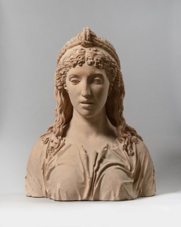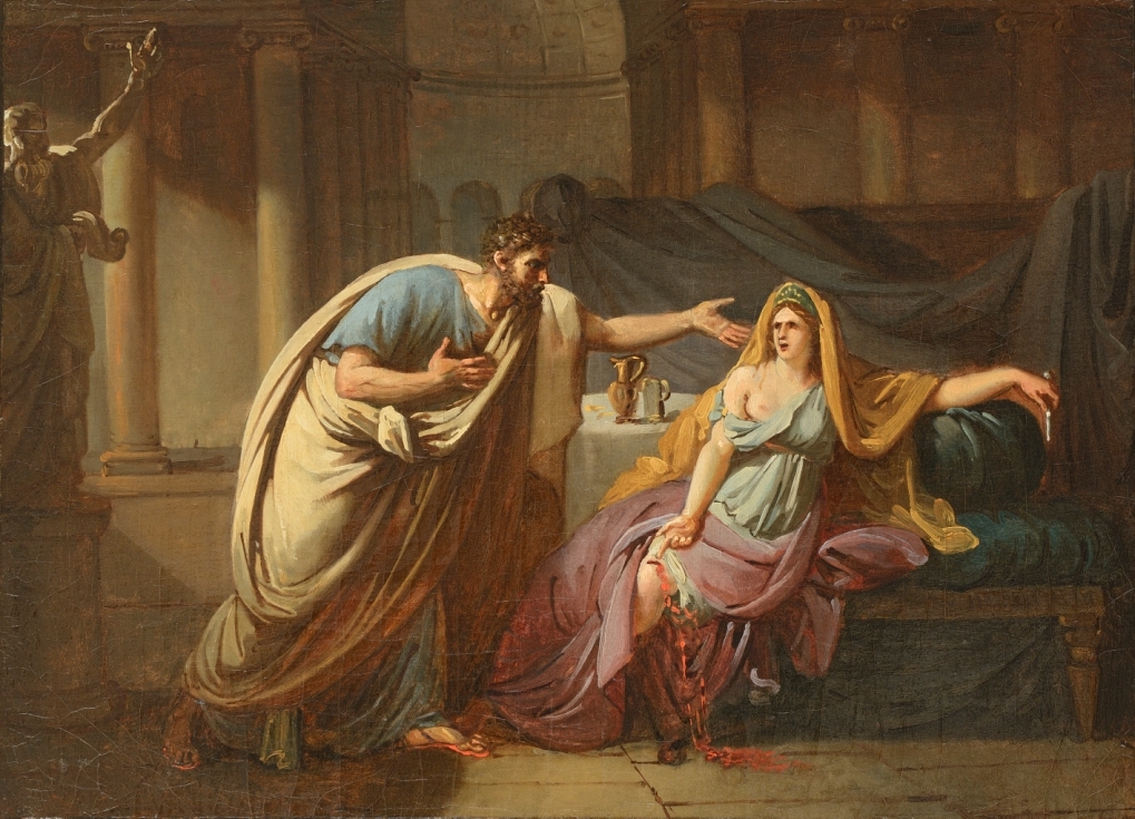 The blood red is surprisingly echoed in Brutus’ sandals and thus anticipates his participation in Caesar’s assassination. The rest is painted in a sober pale palette varying from yellows to indigo blues, so as to concentrate more on the two protagonists’ dramatic spontaneous attitudes and faces. The husband’s severe one is manifestly drawn from Brutus in Guillon-Lethière’s sketch presented in the 1793 Salon (private collection) or from Cato in the Death of Cato of Utica painted by the same artist in 1795 (Saint Petersburg, Hermitage, inv. 1302). As for Porcia, her face resembles a mask from Greek tragedy, with no whites left in her eyes and her mouth half open.