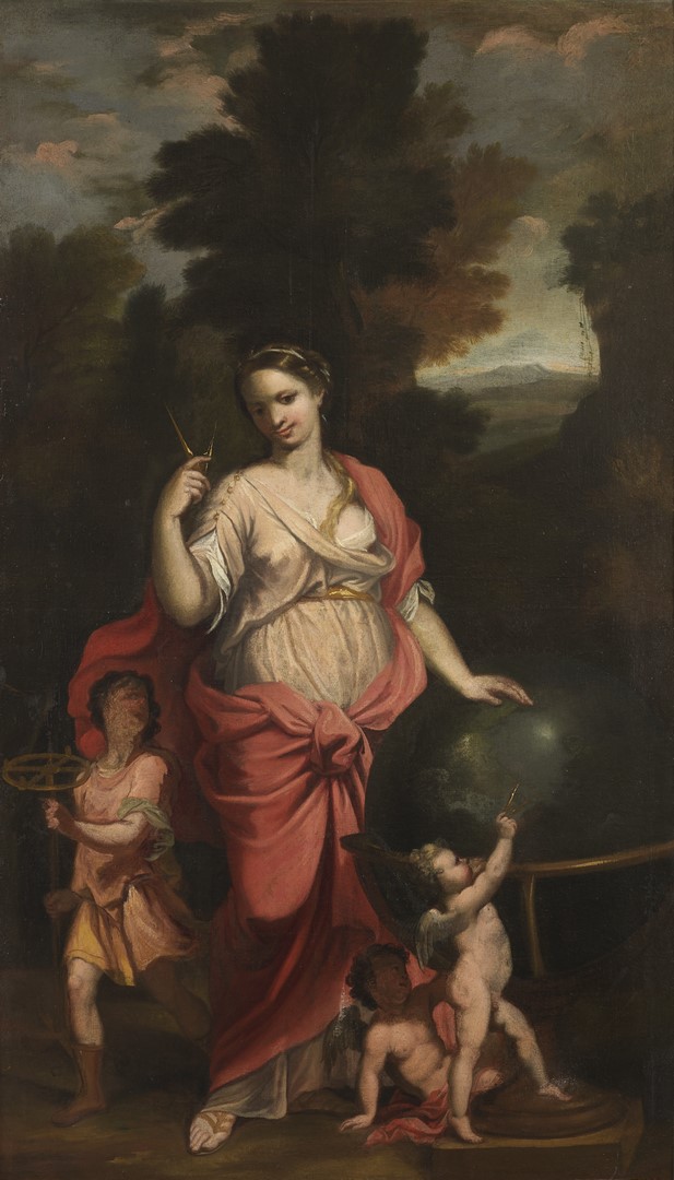 The terrestrial globe, positioned on the ground, is present in Geometry, personified by a young woman draped in pale pink and crimson. As opposed to her companions, this allegory is seen in a verdant landscape. At her side, a spirit holds a theodolite or graphometer, while little putti measure distances on the globe.