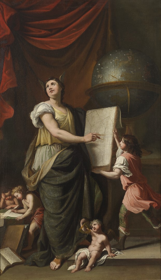 Astronomy stands in a space marked out by a red drapery. Little wings decorate her head and her tunic is light yellow and night blue. Her eyes turned to the sky, she measures Pythagorean squares with a compass held by a young spirit without wings. The background is blocked by a large celestial globe rising from a pedestal.