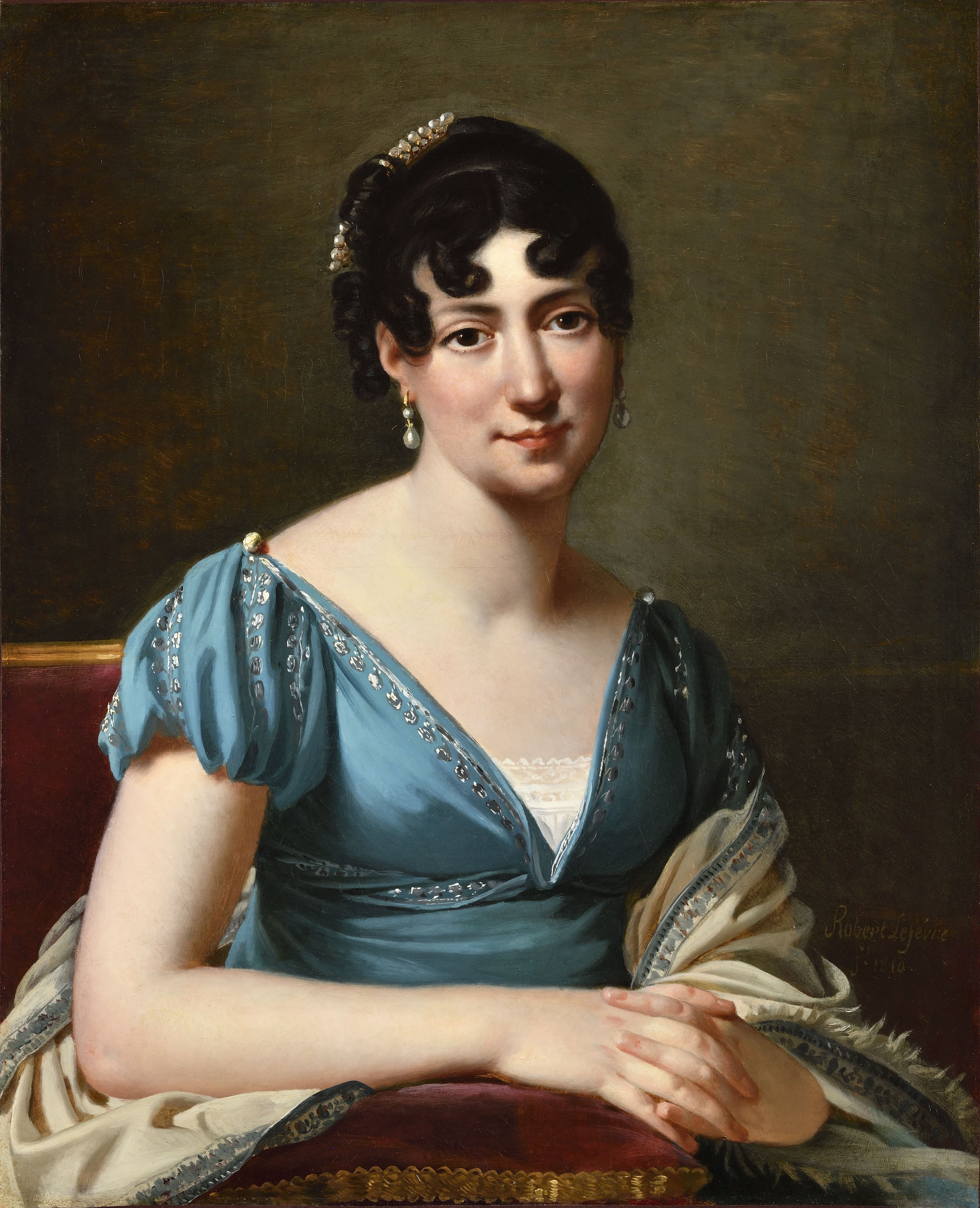 The half-length portrait of a woman is presented against a brushed copper-green background. The sitter is depicted serenely seated on what appears to be a gilt wooden armchair with Empire red velvet upholstery and resting her hands delicately on a cushion of the same hue with gilt braid. She wears a high-waist short-sleeved low-cut V-neck blue dress edged with silver thread embroidery and belted with a sash. In addition to the magnificent ivory-colored embroidered shawl which has slipped off her right shoulder, her hair is held by an elegant little comb whose gold mount is decorated with pearls accompanied by a matching set of ear pendants, symbols of a comfortable social condition. Our sitter’s hairstyle follows the fashion launched by the Beauharnais in which hair is pulled back into a bun from which escape thick curls falling over the forehead.