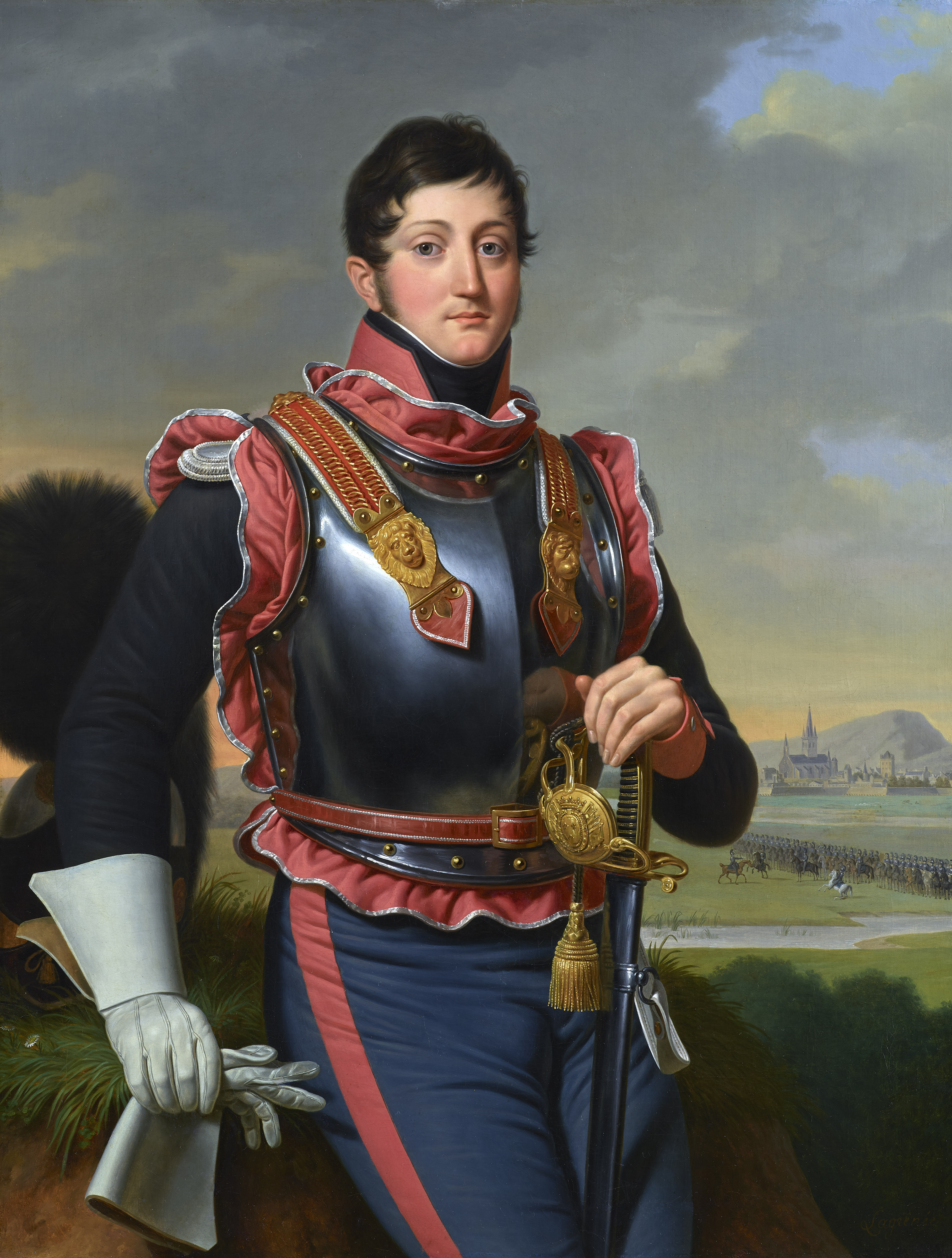 This painting, an arresting example of Lagrenée’s excellence as a portraitist, depicts a resplendent officer posing nonchalantly in front of a landscape and gazing at the viewer. Attired in his ceremonial winter uniform with its glowing breastplate over a dark waistcoat and trousers highlighted with scarlet ruffles and trim, he places his bare left hand on the pommel of his sword while his white-gloved right hand holds the other glove. As he casually leans against a low earthen wall, his helmet can be glimpsed resting on its grassy surface behind his right arm.