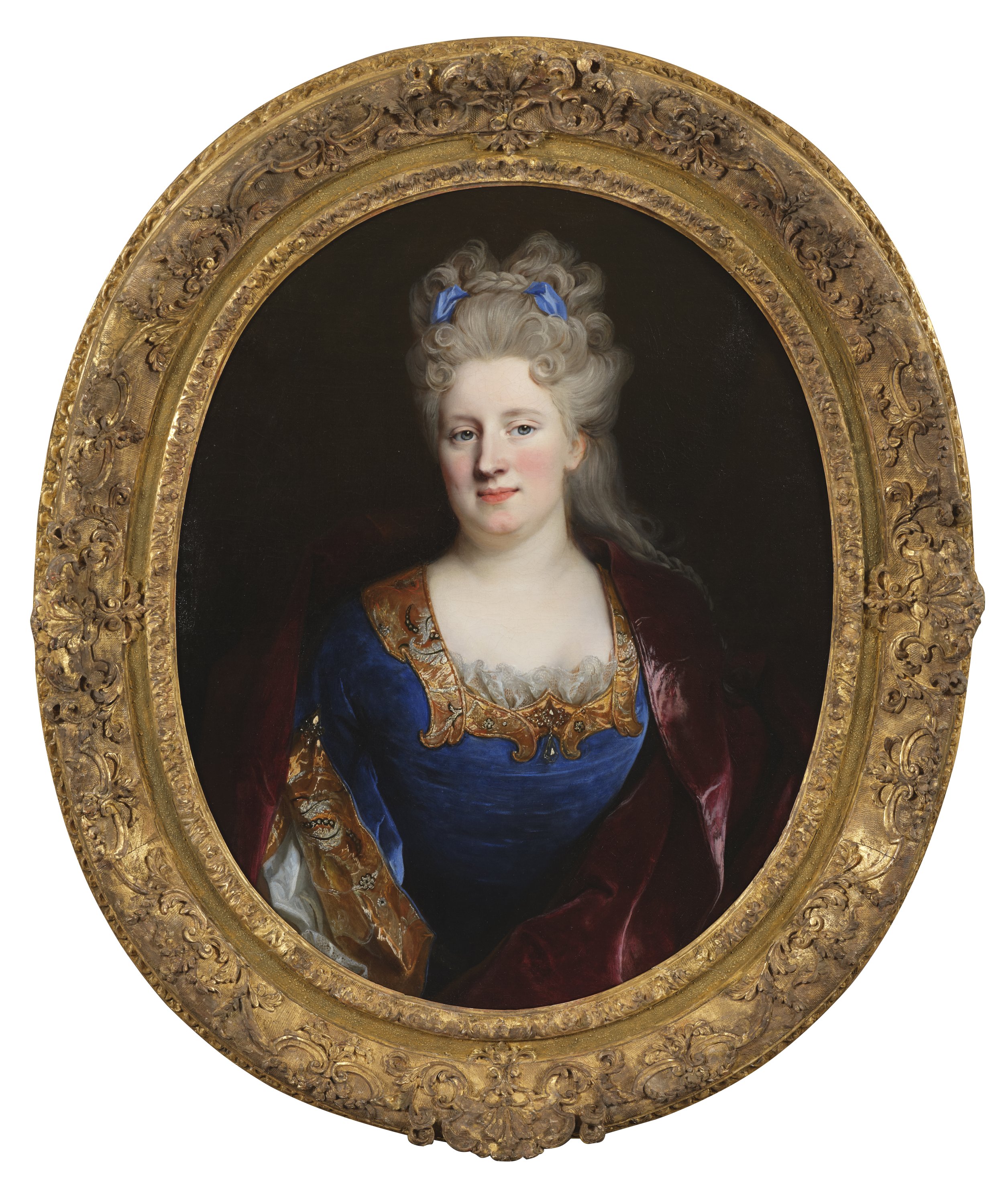 An assiduous student of the Flemish painters, Largillière distanced himself from the severe classical Italianate French style by preferring color to the cold exact line of drawing. Known for his gifts as a colorist, the suppleness of his brushstroke let him render the dazzling harmony of fabrics elegantly by playing the reflections in the blue velvet dress against the gold braid as well as in the cape encircling the sitter.