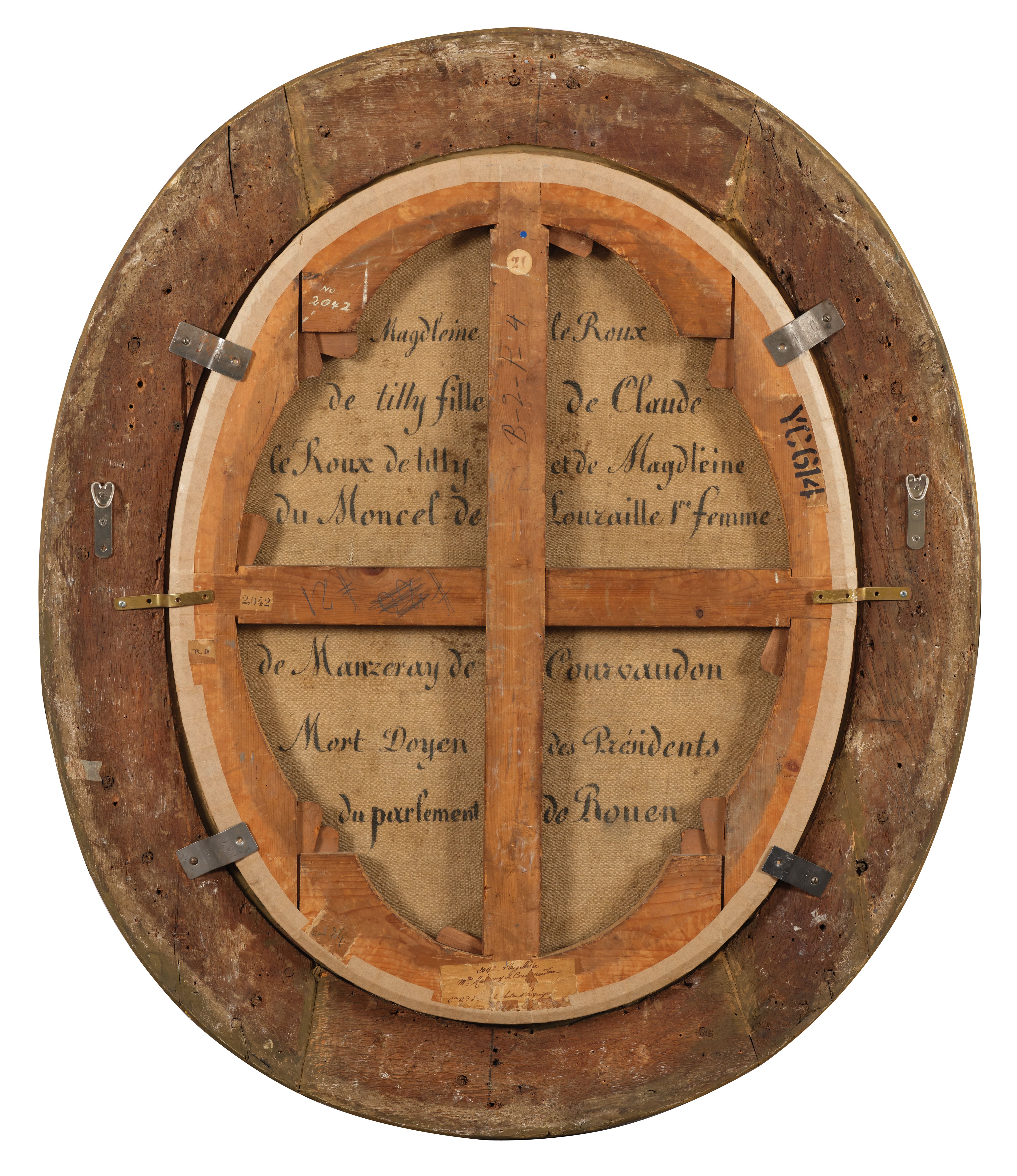 Our painting presents one of these highly demanded female portraits, which often showed wives attired in the latest fashion with corresponding hairdos. It is of Magdeleine le Roux de Tilly, the daughter of Claude Le Roux de Tilly, a Judge at the Appeals Court, and the wife of Manzeray de Courvaudon, the eldest of the Presidents of the Rouen Parlement. Depicted slightly in profile, elegantly turned towards her right, she wears make-up which is carefully applied to bring out her pearly flesh, and wears a hair-do known as the Fontange,(4) in which two blue bows restrain her curls. She is richly attired in a night-blue robe embellished with precious stones and a dark purple cape floating around her whose sumptuousness contrasts with the lighter hues and touch of her delicate face.