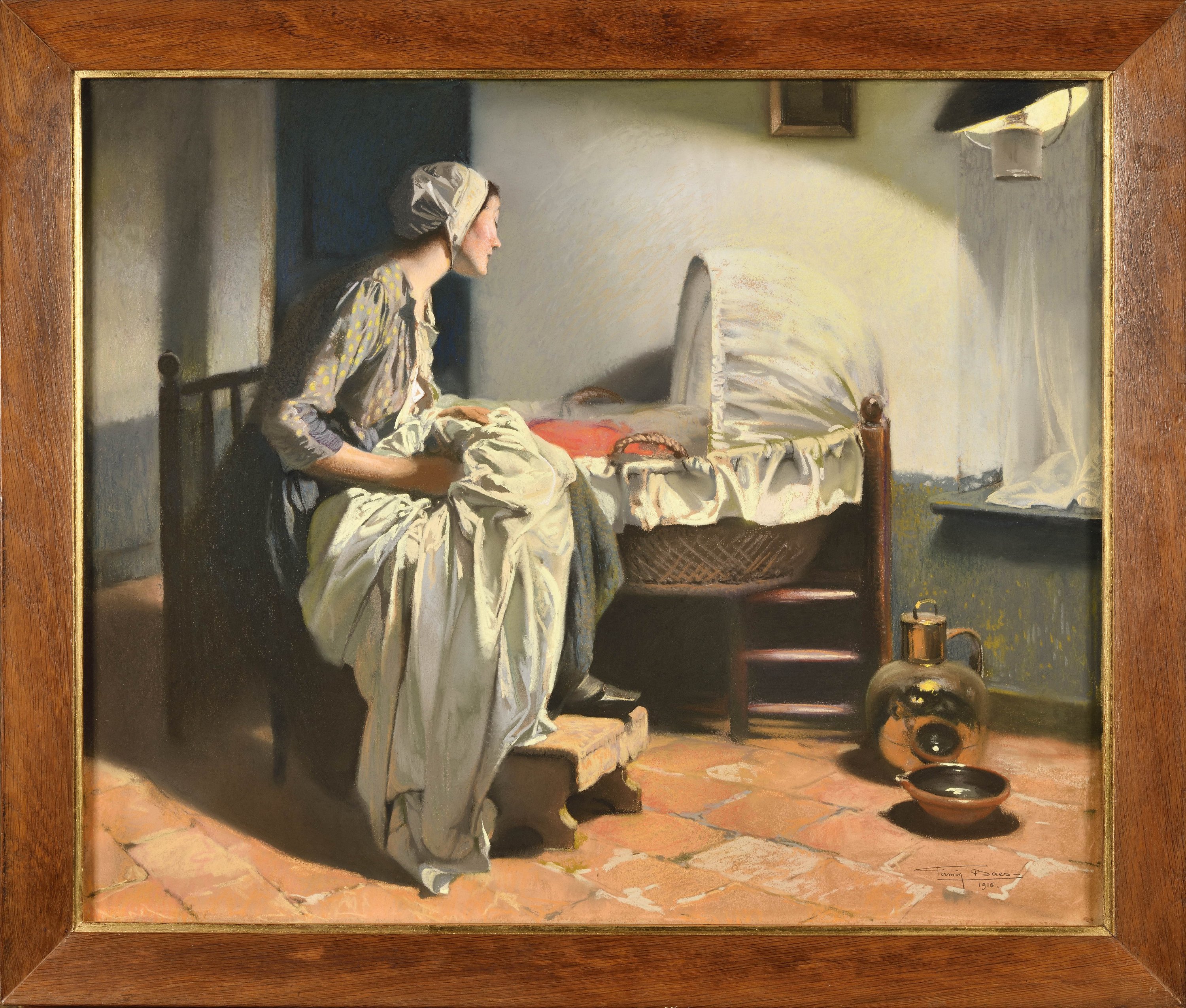 A significant part of the artist’s oeuvre is dedicated to portraying another class of Belgian society: labourers engaged in their work, depicted in the simple beauty of their daily lives. These subjects included a lace maker, a knitter—sometimes asleep, sometimes at her craft (fig. 1)—a young woman at her toilette, or, as seen here, a young woman watching over a cradle. Although the identities of these women remain unknown, it is believed that they were individuals Baes encountered during his summer stays in the countryside, particularly in Faulx-les-Tombes, near Namur. There, he rented the Château de Ville before later purchasing land and building a villa named Le Chenois. It was likely in Faulx-les-Tombes that he enriched his repertoire with these new models, painted from life as cherished memories of his homeland and the rustic atmosphere in which he had grown up—depicted without embellishment.