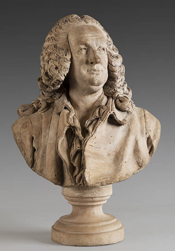 One of them was sent by Caffieri to the Academy in 1784, along with sixteen other busts reproduced or created by his hand. In the letter by Caffieri which accompanied this gift is stated, “Jean-Baptiste Rousseau was made after the portrait painted by Aved. I must execute it in marble for the lobby of the Comédie Française” (cited by Guiffrey, pp. 359-360). This version is probably distinct from the modello, from which Caffieri would not have been separated while his marble was still unfinished. After