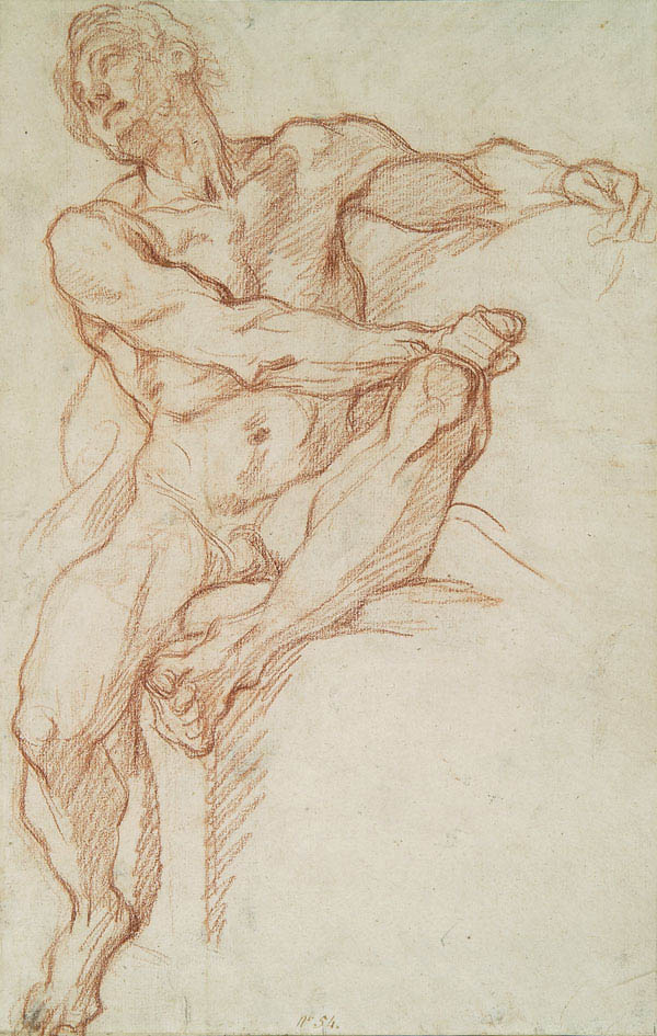 Ce dessin d’un nu assis sur un bloc de pierre est typique des études anatomiques du dix-huitième siècle et doit provenir d’un portfolio ou cahier de dessins. Sa pose très athlétique met en valeur la musculature du modèle : poing droit appuyé sur le genou de gauche, tête en arrière tournée vers la droite, bras gauche tendu. L’artiste démontre ainsi sa maîtrise de l’anatomie dans toute sa complexité.