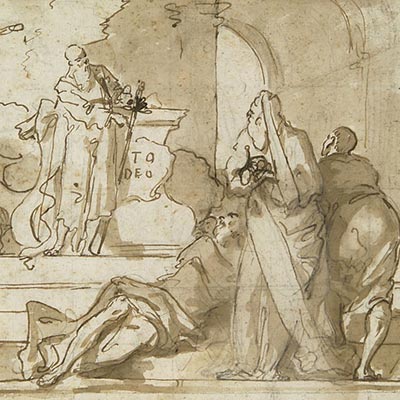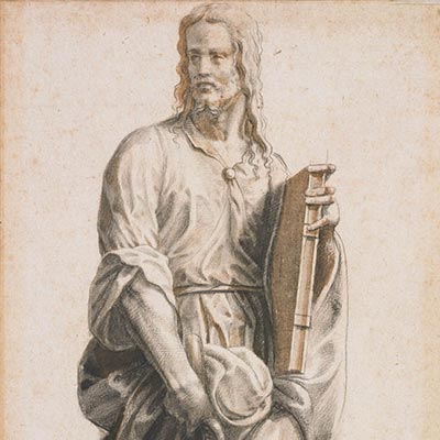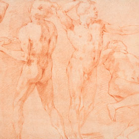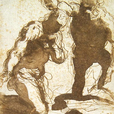 Confronter notre feuille à l’Etude d’un nu masculin et d’une harpie, dessin à la plume et encre brune conservé à la Pinacothèque de Bologne, conforte son attribution à Bertoia. On y retrouve les mêmes caractéristiques graphiques du nu : corps humain déstructuré, écriture nerveuse mais précise. Par ailleurs, le type du visage du vieil homme, au nez busqué, à la barbe séparée en mèches stylisées, rappelle le visage du Saint Ermite de Bertoia (Dijon, Musée des Beaux-arts).