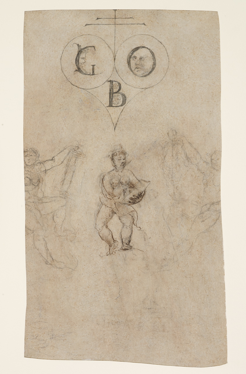 Notre feuille figure au recto une académie d’homme de dos, et une étude de visage d’homme âgé de profil. Des esquisses de personnages, et trois lettres ornées dans un motif cordiforme, sont dessinées au verso.
