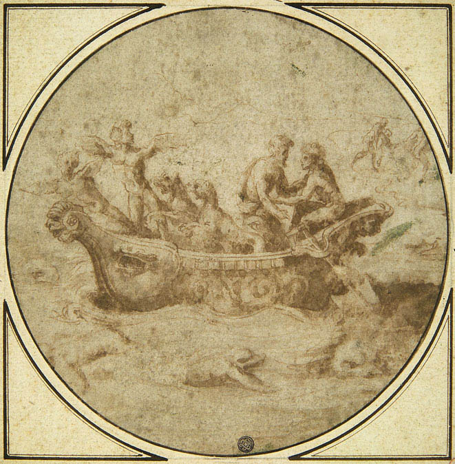 placées sous l’arc de triomphe élevé à Saint Marc » à l’occasion de l’entrée de Charles Quint à Rome. Le dessin à la plume et encre brune conservé à l’Ecole de Beaux‑Arts (Inv. EBA n° Mas.333) et intitulé « Le char de la lune et du soleil », rentre dans cet univers des dessins préparatoires pour des décors éphémères.
