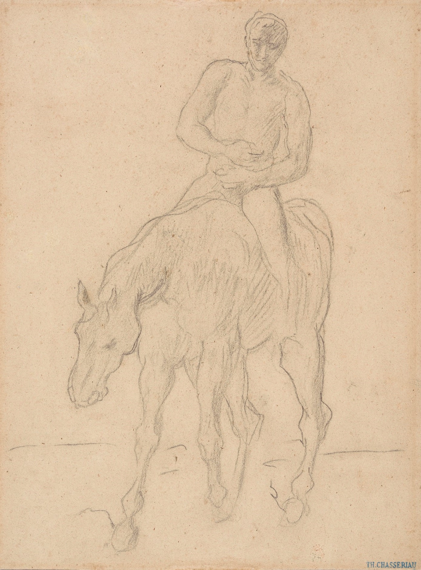 Témoin des recherches esthétiques incessantes de Chassériau et de la variété de ses thèmes, notre feuille peut être datée assez précisément de 1853, une année particulièrement féconde dans la vie de l’artiste. Il achève le décor de la chapelle des fonds baptismaux de l’église Saint-Roch à Paris et obtient un grand succès au Salon pour son Tepidarium, acheté par l’État quinze jours après son exposition. La même année, il réalise le Retour des blessés, un petit panneau poignant dans la lignée des Cavaliers arabes enlevant leurs morts de 1850 (Cambridge, Harvard Art Museums, inv. 1943.219), peut-être une esquisse préparatoire pour une toile jamais réalisée. La verticalité statique et l’isolement des personnages tranchent avec la violence tourbillonnante des chocs de cavalerie arabe que peignait Chassériau après son retour de l’Afrique du Nord. Notre étude rapide d’un cavalier nu vacillant sur sa monture est l’une des premières pensées pour le personnage à l’arrière plan. Elle est à rapprocher d’un croquis très semblable au crayon noir sur papier bleu (21,3 x 24,1 cm, Paris, musée du Louvre, inv. RF 24457), ainsi que d’un autre figurant un cheval portant deux cadavres (crayon noir, 21,9 x 23,4 cm, inv. RF 24479).