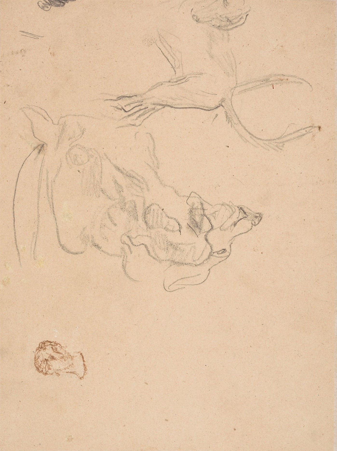 Le verso de notre feuille montre des beagles et une tête de cheval et se rapporte au portrait terminé en 1854 de l’ami intime du peintre, Oscar, comte de Ranchicourt, partant à la chasse à courre. Deux autres études au crayon de chiens et de chevaux pour cette toile sont conservées au Louvre (inv. RF25066 et 25302) qui garde également des dessins préparatoires au pendant qui représente la comtesse Pauline Clotilde née de Buus d’Hollebèque (Montréal, Musée des Beaux-Arts, inv. 2015.229).