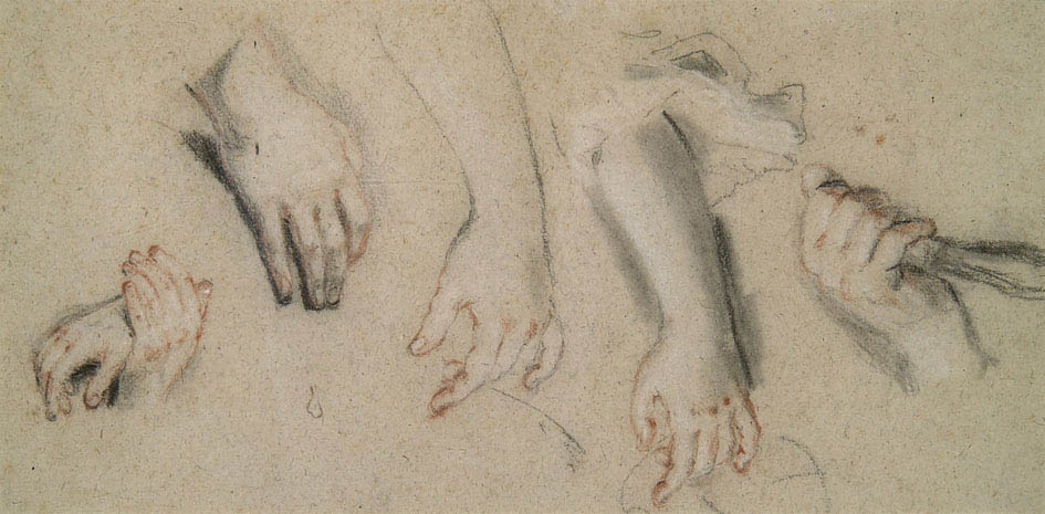 Pierre noire, sanguine et rehauts de craie blanche sur papier crème