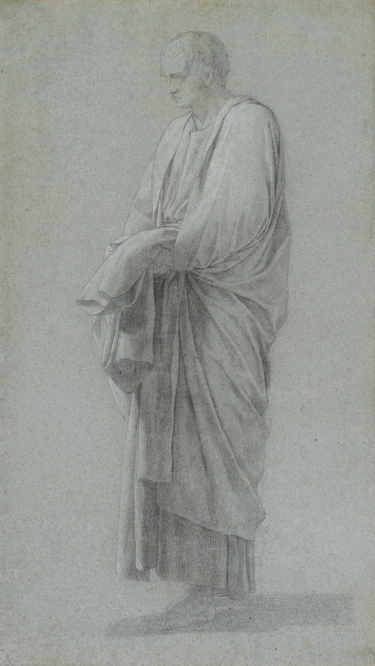 Suvée dessine ici des personnages monumentaux, dans la lignée de l’esthétique classique. La ligne est pure, soulignée d’un fin clair-obscur sublimé par le bleu du papier vergé. Le modelé des drapés, précisément travaillé, évoque celui des bas-reliefs antiques. Bien que réalisés en vue d’un tableau, les deux dessins ont un caractère achevé. Leur orientation est d’ailleurs différente dans la peinture : les profils sont modifiés, et le bras droit du jeune homme apparaît. Les figures seront en outre partiellement tronquées pour être intégrées à la composition.