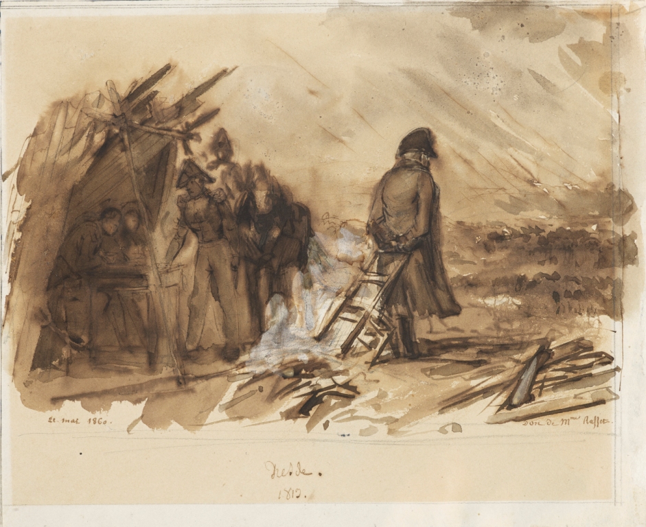 Préparatoire à cette lithographie, notre dessin prouve que l’artiste avait envisagé de dramatiser encore davantage la scène, tout en la rendant plus triviale et en la situant plus exactement à Dresde, au petit matin pluvieux du deuxième jour de la bataille, le 27 août 1813. Si l’on y retrouve la hutte des aides-de-camp et l’officier tels qu’ils figureront, logiquement en contrepartie, dans la planche de L’Artiste, le reste est tout différent. S’appuyant sur sa chaise, l’empereur est ici vu de dos, observant la manœuvre des troupes dans la plaine. Sa silhouette immédiatement reconnaissable, légèrement courbée, ne laisse en rien deviner les pensées qui l’absorbent et lui font ignorer l’orage qui s’abat sur le champ de bataille.