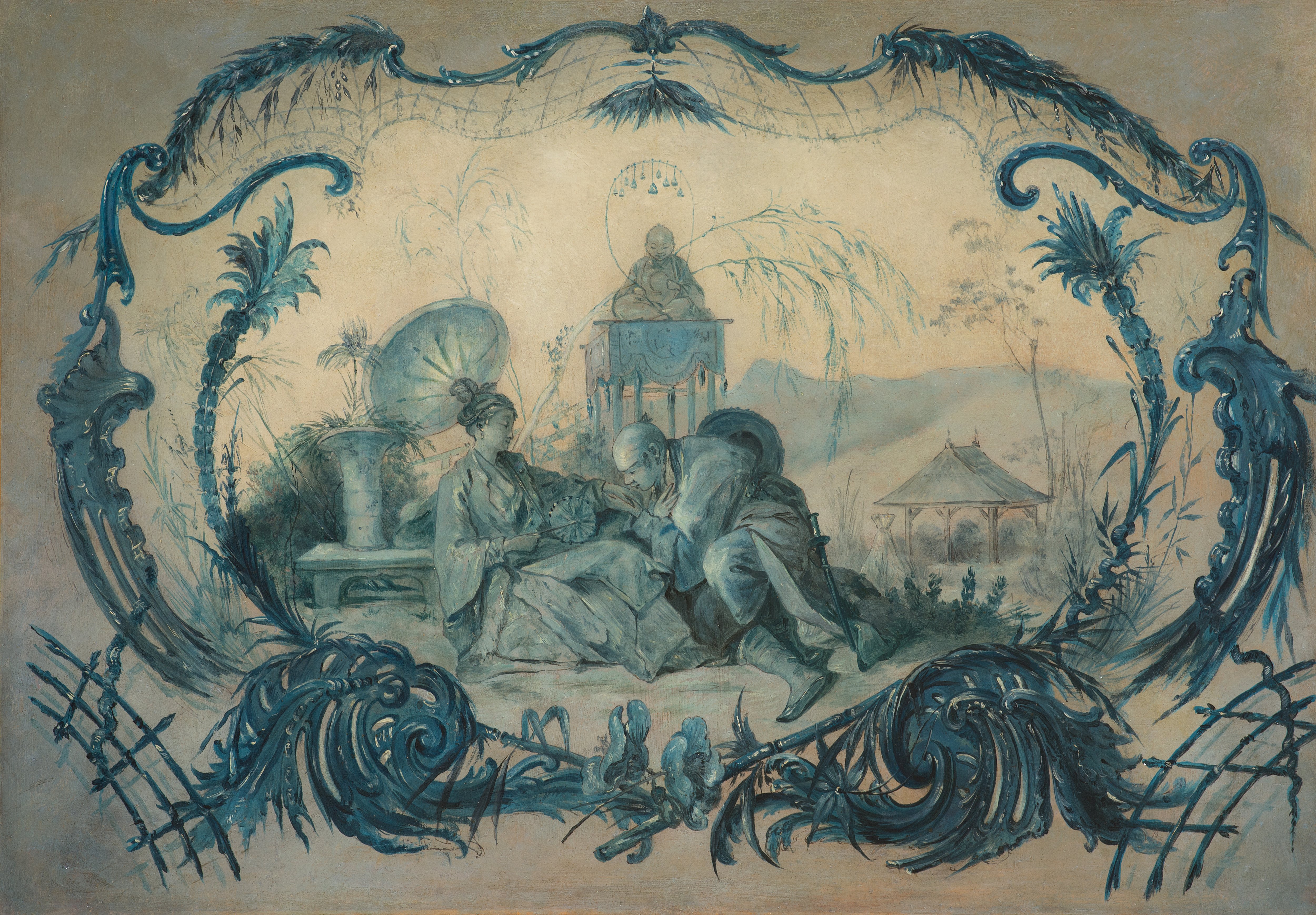 François Boucher a toujours travaillé en s’appuyant sur des esquisses, le plus souvent sur toile, quelquefois sur papier ou sur carton (Paris, musée du Louvre, Département des Arts graphiques, inv. 26214). Elles lui permettent de définir sa première pensée et de proposer à l’éventuel commanditaire un projet précis. L’artiste se réserve ensuite de reprendre à part certaines figures et de modifier légèrement si nécessaire les postures ou les effets de clair-obscur et d’ombre avant de passer à l’exécution définitive du tableau. L’esquisse est recommandée aux artistes et couramment pratiquée car, quel que soit son support, elle permet d’exprimer en clair et presque de capturer la première pensée : Roger de Piles, théoricien des coloristes de la fin du XVIIe siècle, livre dans son Cours de peinture par principes de 1708 l’exacte définition de cet usage quand il précise que l’esquisse coloriée est faite « pour le repos et le soulagement de la mémoire » du peintre . Et, pour ces esquisses, le camaïeu monochrome est recommandé, car il est ” comme un dessin lavé où l’on observe la dégradation des objets pour former les lointains & faire fuir les objets par l’affaiblissement des teintes. Les clairs et les ombres doivent y être observés » . Chez Boucher ces esquisses monochromes sont le plus souvent des grisailles ou des camaieux de bruns, et plus rarement des roses ou des bleus . Le choix du bleu est ici impératif car le tableau auquel prépare cette esquisse doit être peint dans des tons bleus et inséré dans un décor bleu et blanc déjà existant, inspiré de la porcelaine chinoise. Les tons bleu - vert froids de l’esquisse, familiers à Boucher qui les utilise souvent, en particulier dans ses paysages d’Ile de France des années 1740, seront corrigés dans l’exécution définitive du tableau, car il est peint dans des tons bleu outremer profonds puisqu’il doit s’intégrer au décor de la Chambre bleue du château de Choisy, déjà installée et en partie meublée.