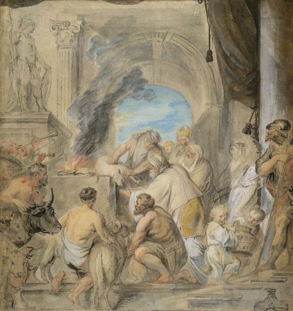 Représentant de l’art septentrional et plus largement de l’art flamand du XVIIe siècle, Jacob, ou Jacques Jordaens, comme il signait lui-même dans ses lettres , naît et meurt à Anvers. Placé entre les mythiques figures de Pierre Paul Rubens (1577-1640) et celle de Antoine van Dyck (1599-1641), Jordaens jouit lui aussi d’une grande réputation de son vivant. Il est considéré comme un excellent peintre de genre inventif, dont les sujets les plus fameux demeurent Le Roi Boit ! et Les jeunes piallent comme chantent les vieux, qui ne représentent cependant qu’une infime partie de son œuvre puisque l’artiste s’illustre tout aussi bien dans la peinture mythologique. Le nombre considérable de ses dessins préparatoires permirent à l’artiste de donner naissance à de spectaculaires compositions, dont la plupart sont conservées dans des collections publiques à travers le monde. Parmi la multitude de sujets mythologiques, traduisant une consommation régulière de textes d’auteurs antiques, Jordaens s’attache avant tout à représenter le genre humain, traité avec un grand réalisme. Les figures centrales sont systématiquement héroïques.