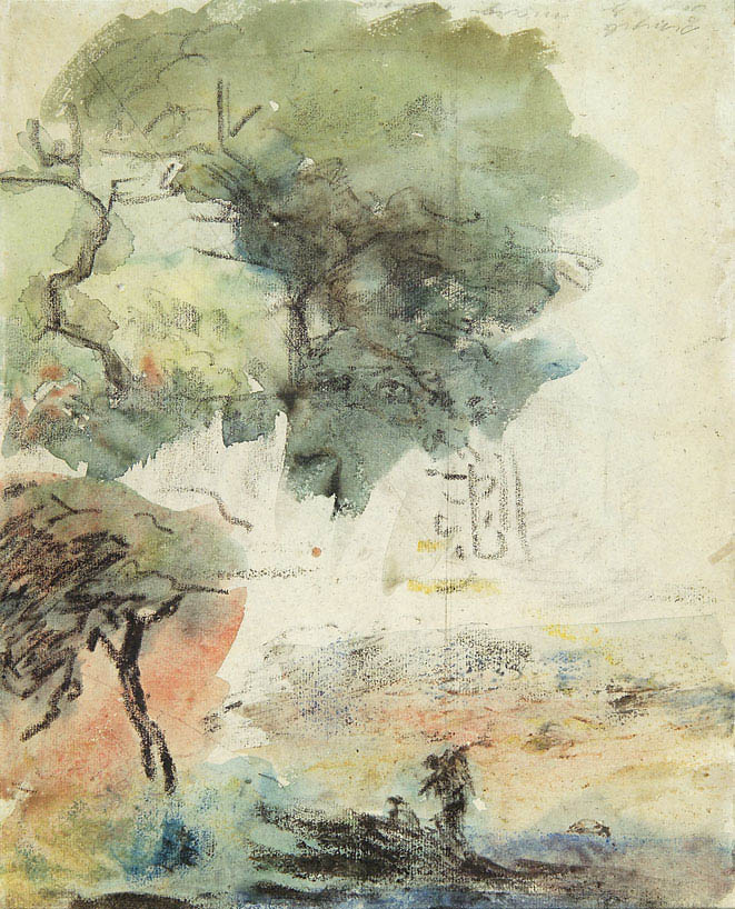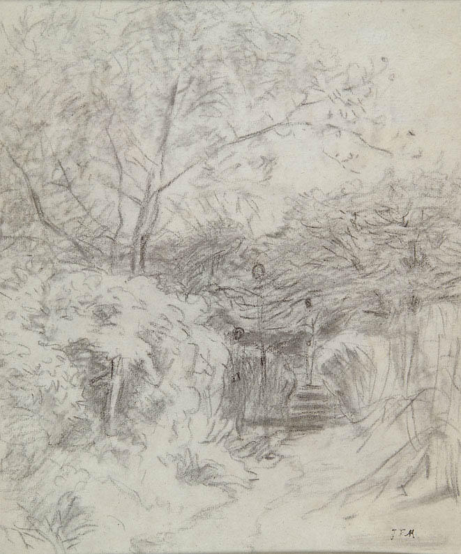 Notre feuille travaillée recto verso, d’abord au pastel et à l’aquarelle, et à la pierre noire au dos, montre bien l’intérêt de Millet pour la végétation luxuriante de Barbizon, et de la Forêt de Fontainebleau toute proche, qui n’auront pas manqué de marquer profondément son travail. L’artiste livre ici l’évocation d’un paysage rêvé et énigmatique, à peine animé par les deux figures au pastel noir en bas de feuillet. La sérénité de l’artiste est ici bien palpable : apaisé et ravi par la contemplation de la nature, et loin du charivari de la cité, Millet rend hommage ici au paysage qui l’entoure. L’ensemble est comme à l’accoutumée chez Millet, d’une facture assez dépouillée, avec cette sincérité et cette absence d’artifices, de mise en scène dramatique ou de démonstration qui caractérise bien son œuvre, même dans les travaux les plus mineurs.