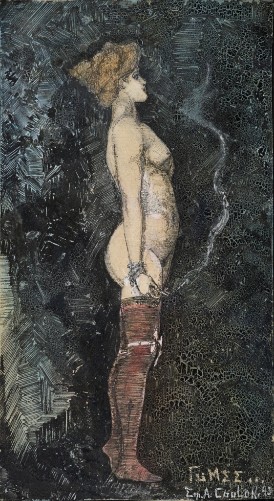 Toutefois, le dessin de Coulon est dépourvu de toute allusion morbide et de toute satire des mœurs bourgeoises qui transparaissent souvent dans les œuvres de Rops, caricaturiste à ses débuts. Chez notre artiste, la représentation féminine oscille entre fascination et poésie. L’encre entourant le visage de profil du modèle, crée un halo sombre participant à son aura mystérieuse. Bien que la jeune femme révèle des indices sur sa condition de prostituée, tels les bas rouges et surtout la cigarette, elle est hiératique comme une statue antique et offre un profil fin et délicat. Comme chez Rops, le titre participe de la lecture de l’image, mais si ce dernier recherche la provocation et l’amusement, Coulon interroge et poétise le quotidien. « Fumée... » peut ainsi être lu comme une métonymie du personnage, allusion à ses amours volages et à la précarité de son existence.
