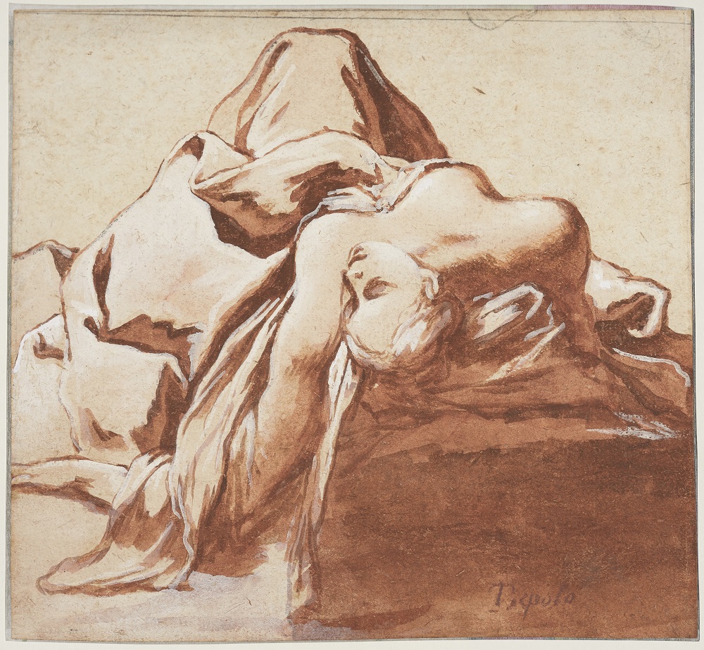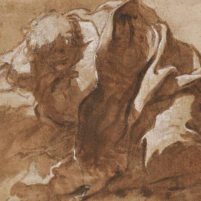 A contrario du recto si fini, la figure assise ébauchée au verso, rognée et imprécise, apparait comme une recherche classique d’une mise en place destinée à être traduite sur un autre support. Aussi, bien que ni ce personnage aux pieds nus, ni la jeune femme évanouie du verso, ni les figures des autres dessins semblables n’apparaissent tels quels dans aucune des compositions peintes de Caula, il paraît judicieux de les dater des années 1680 et de rapprocher certaines feuilles, dont la nôtre, de la grande toile peinte en 1685 pour l’église San Carlo de Modène. Ce tableau de Saint Charles Borromée administrant l’Eucharistie aux pestiférés lors de l’épidémie de 1576 à Milan, fut l’occasion pour l’artiste de représenter les corps en souffrance sculptés dans une lumière surnaturelle, dont une jeune femme au seuil de la mort soutenue par ses compagnes et qui fait songer à notre dessin, malgré une pose assez dissemblable. La correspondance est en revanche frappante avec une jeune mère gisant à terre dans le maître-autel de San Carlo réalisé en 1699 par Marcantonio Franceschini (1648-1729) dans un style tout autre. Il est probable que le Bolonais, invité en 1694 pour orner de fresques la salle d’honneur du palais ducal, avait accès à l’étude de Caula qui, en tant que peintre en titre des Este, supervisait les travaux de décoration.