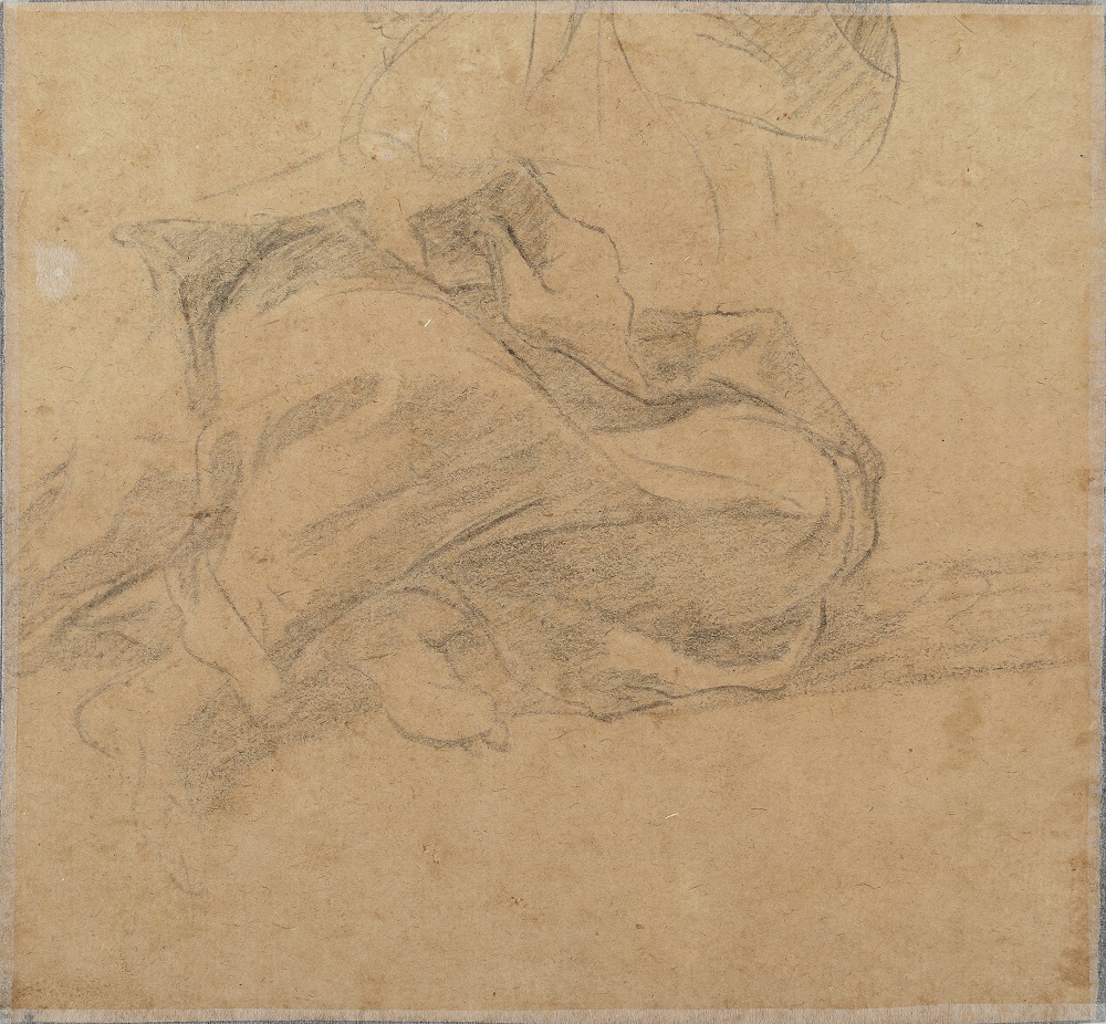 Notre œuvre fait partie d’un groupe formé par James Byam Shaw autour de la feuille conservée à la Fondation Custodia et à partir des œuvres provenant pour la plupart de la collection de Giuseppe Vallardi (1784-1863). Réalisés aux deux lavis de sanguine (brun et légèrement rosé) et rehaussés de blanc de plomb, ces dessins présentent des figures drapées, vues dans des poses complexes. Certains comportent, au verso, des études plus rapides à la pierre noire ou à la sanguine de figures, de détails anatomiques ou de drapés comme ici.
