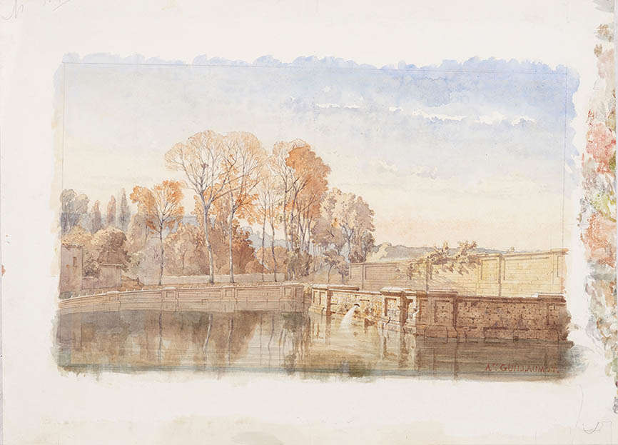 Nos deux aquarelles n’apparaissent pas dans le catalogue de vente, vraisemblablement achetées par un amateur du vivant de Guillaumot, ce qui expliquerait l’année 1860 portée sur le cartel de L’Abreuvoir alors même que l’œuvre n’est pas datée. Il s’agit d’un dessin d’après nature, réalisé à main levée à la sanguine, puis retravaillé dans l’atelier au crayon et à l’aquarelle, avec une attention particulière portée aux verticales et à la perspective. Nul doute que cette feuille servit de modèle à l’estampe exposée en 1857 qui en reprend très exactement les moindres détails, exception faite de quelques modifications minimes : la partie gauche rognée, personnages présents autour du bassin, rendu plus minutieux. De fait, de tous les croquis et relevés réalisés par l’artiste lors de ses premières excursions à Marly, L’Abreuvoir méritait plus que tout autre les honneurs du Salon puisqu’il montrait la seule réalisation de Jules Hardouin-Mansart qui échappa à la démolition du château bien que privée des célèbres Chevaux de Coustou, conservés au Louvre.