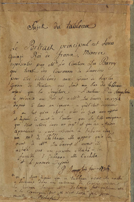 Le Portrait principal est Louis Quinze Roi de France, Minerve représentée par Mde La Comtesse Du Barry qui tient des Couronnes de Lauriers pour être distribués aux Genies de tous les Genres de Peinture qui sont au bas du tableau ainsi que la Sculpture. L’auteur P. [sic] de Sompsois le présenta au Roi et à Mde Du barri [sic] en 1774. depuis Ce tems on ignora ce qu’il étoit devenu. Ce ne fut qu’en 1806 plus de 30 ans après et depuis la mort de l’auteur que sa fille unique qui étoit retirée dans un dept et que des affaires appellèrent à paris retrouva le tableau chez un md de Tableau elle apprit qu’à la mort de Mde Du barry il avait été acheté par une personne attaché à la famille d’Orléans. Elle l’acheta et la possède depuis.