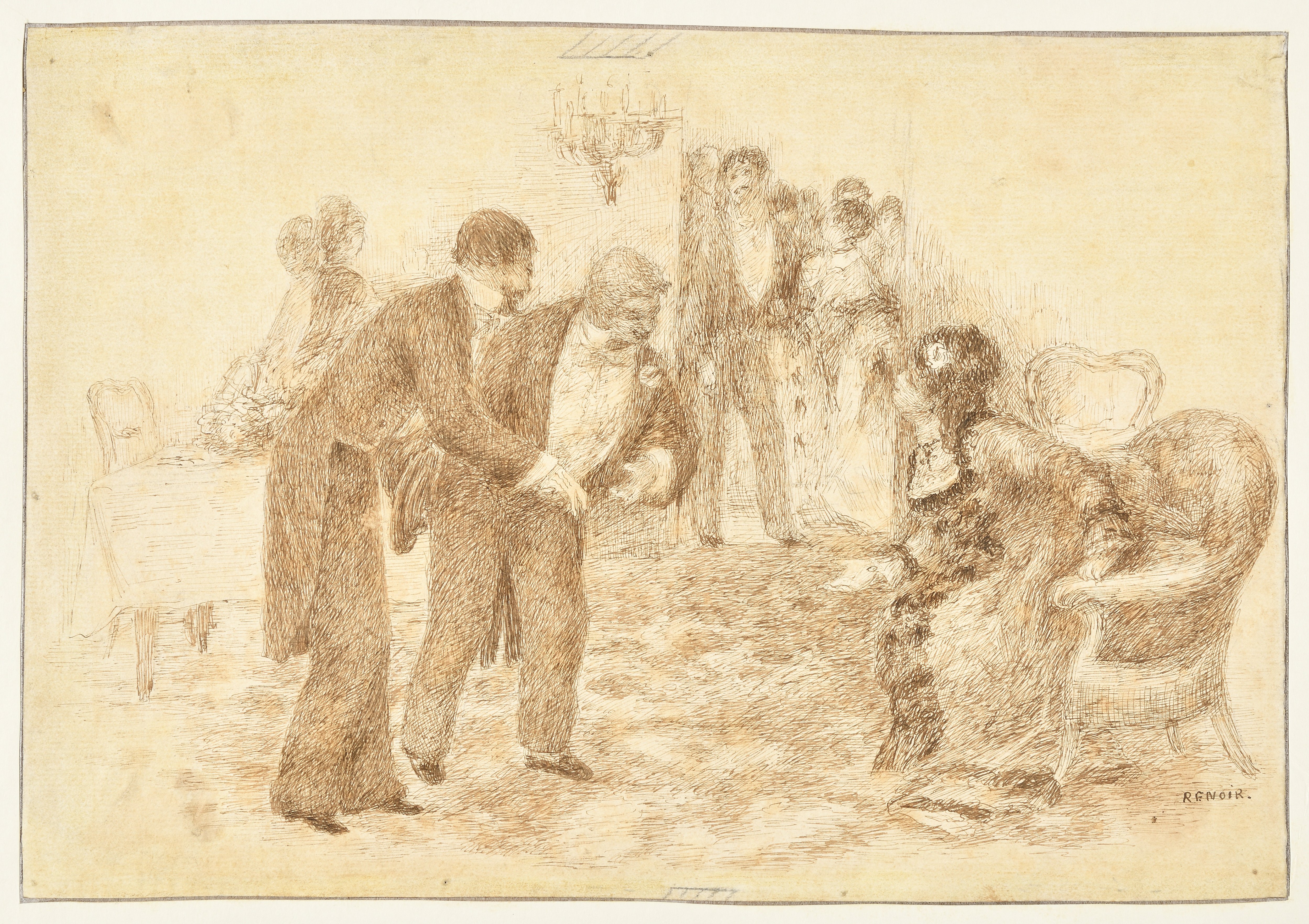 L’article de Daudet est décoré de deux illustrations de Renoir : une lettre ornementale D (ill. 2) et une scène représentant un Salon mondain, en fin de texte (ill. 3). Notre dessin à l’encre est l’œuvre originale utilisée pour cette illustration, reproduite dans l’ouvrage grâce à un procédé photomécanique. L’essai de Daudet fait allusion au Salon tenu par madame Charpentier, née Marguerite-Louise Lemonnier (1848- 1904), épouse de Georges Charpentier (1846-1905), éditeur des