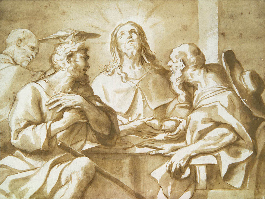 Notre dessin à la plume et au lavis brun raconte un passage du Nouveau Testament tiré de l’Evangile de Saint Luc (24, 13-35). Thème maintes fois adapté dans l’histoire de l’art, on peut notamment en voir deux versions par Rembrandt et Le Titien au Louvre.