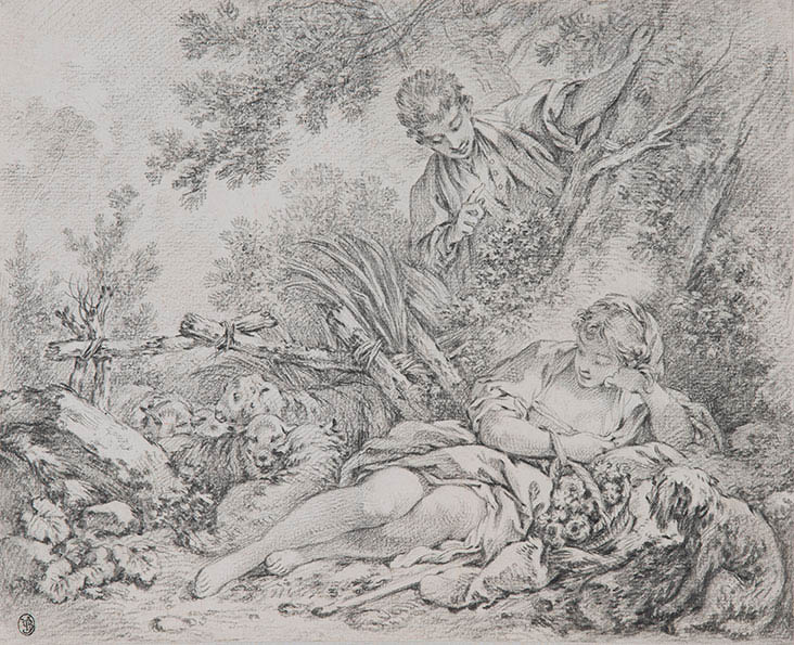 Ici donc, nous assistons à la rencontre fortuite entre une bergère et un jeune garçon. La scène est attendue mais notre artiste a su ici la réinventer avec la mesure et le sens de l’harmonie qui le caractérisent : tout y est calme, raffiné et élégant. Comme le dit Jean François Méjanès, « cette aisance à évoquer un naturel autrefois étudié directement sur le motif et à le recomposer de manière plaisante caractérise Boucher. ». Il nous raconte ici sous les traits de pierre noire, le repos de la bergère, troublé par quelques bagatelles dont il laisse le spectateur imaginer les saveurs et rêver ce que sera la suite de cette journée bucolique parmi les feuilles, les fleurs et les fruits. Dans notre dessin, la végétation finement rendue, est ici reine et sert véritablement d’écrin au corps délicat de la bergère.