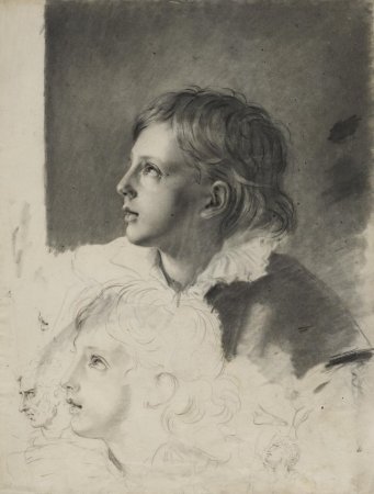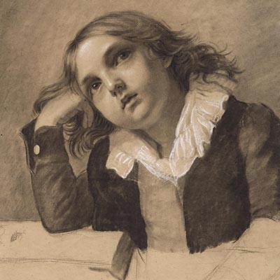 Nourrie d’ambitions artistiques égales à celles des hommes, Auzou peint brillamment la peinture d’histoire et aime s’exercer dans le rendu de portraits en multipliant les esquisses. Tout comme notre dessin, nous connaissons d’autres exemples de la main de l’artiste démontrant des croquis saisis dans l’instant, retravaillés à l’aide de l’estompe et de rehauts de craie ou de pastel dont une partie est laissée volontairement inachevée (ill. 1). C’est le cas de l’étude de jeune garçon accoudé sur son bras droit (ill. 2). Sur une feuille de papier chamois similaire à notre œuvre, Auzou utilise la pierre noire, renforcée de fusain pour tracer les contours de ce visage traité en rondeur reflétant l’innocence juvénile du modèle. Dans une volonté de rendre la vérité de l’expression et la vivacité du regard, elle utilise la craie blanche de façon minutieuse soulignant ainsi les pointes de lumière : une petite pointe rehausse l’arête du nez, d’autres illuminent les pupilles du modèle.