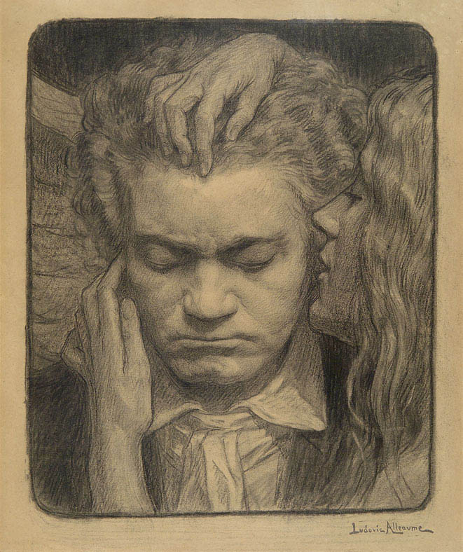 Notre portrait au fusain de Ludwig Van Beethoven est un dessin préparatoire pour une lithographie datée de 1912 représentant le compositeur allemand inspiré par une muse qui lui sussure à l’oreille le souffle de l’inspiration. Cette muse caressant les cheveux du grand compositeur n’est pas dénuée de sensualité et reflète le goût de l’époque pour le Symbolisme finissant.