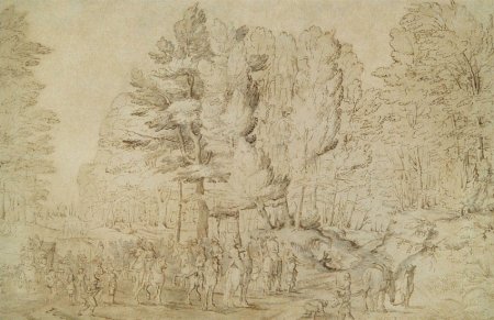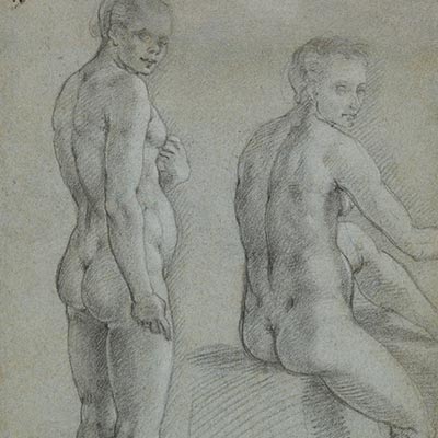 Ainsi fit l’auteur de notre dessin qui voulut garder en mémoire la figure de l’apôtre en omettant son environnement d’architecture. Peintre plutôt que sculpteur, l’artiste vraisemblablement lorrain se passionna pour la posture plastique du saint, la ciselure des drapés, le fort éclairage droit – venant du dôme – soulignant les volumes. Pour notre artiste, cependant, le Saint Jacques est moins une statue qu’une figure humaine. Il n’hésite pas à parfaire sa première ébauche faite in situ à la pierre noire en repassant les parties dans l’ombre au lavis brun qui devient, comme souvent chez les maîtres du nord de l’Europe, couleur et suggère le maroquin du livre, le châtain des cheveux ou la terre battue du sol.