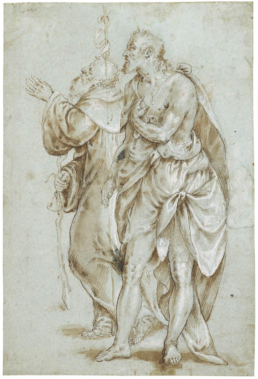 La musculature proéminente des personnages, leur pose équilibrée non sans une certaine élégance maniériste, les doigts longs, la finesse des détails, la chevelure serpentine,les drapés lourds descendant en plis verticaux, les ombres portées nuageuses rappellent en effet les saints qui peuplent les retables de Marescalchi et trouvent leur écho dans notre dessin. À l’inverse des feuilles d’Oxford et de Brunswick, celui-ci est moins énigmatique, car les deux personnages sont aisément identifiables grâce à leurs attributs : Saint Jean Baptiste et, derrière lui, avec son bâton noueux et sa clochette, Saint Antoine le Grand ou l’Abbé. L’esquisse concerne de toute évidence la partie droite d’un retable représentant les saints devant la Vierge à l’Enfant sur son trône, selon une composition semblable à celle de la Pala de San Bernardino à Pignolo peinte par Lorenzo Lotto en 1521.