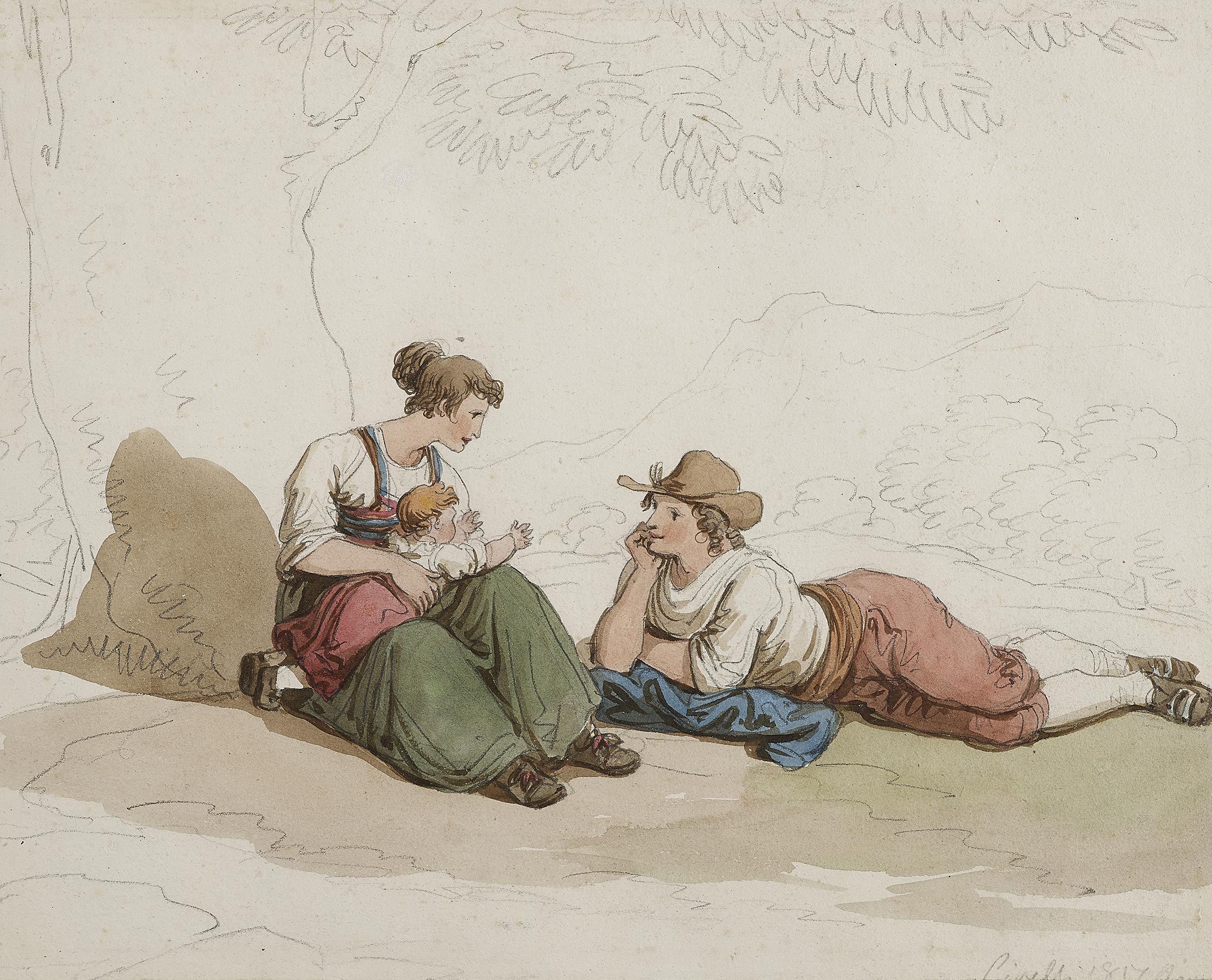 Pinelli publia en 1809 un premier recueil à l’eau-forte de Costumi pittoreschi, suivi l’année suivante de Motivi pittoreschi i costumi di Roma. Il y dévoile une Rome emplie de poésie, croquée dans la simplicité des coins de rues, sur le pas des portes ou les marches des fontaines. La vie familiale y occupe une place de choix, comme l’illustre notre dessin. Dans une verve pleine de fraîcheur, Pinelli représente ici une jeune famille. Assise au pied d’un arbre, une femme au profil de statue antique tient sur ses genoux son petit garçon. Ce-dernier tend les bras vers son père, allongé à côté, une main sous le menton. Pinelli situe ses modèles dans une campagne esquissée par quelques traits de crayon. Selon son habitude, l’aquarelle s’est concentrée sur les personnages : rouge, bleu, vert et brun animent leurs vêtements traditionnels. On retrouve une manière similaire de composer la scène chez les Paysannes de Frascati dont l’une allaite un enfant (Chantilly, Musée des Beaux-arts, 1820) ; la jeune femme debout y a un profil semblable à celui de notre jeune mère.