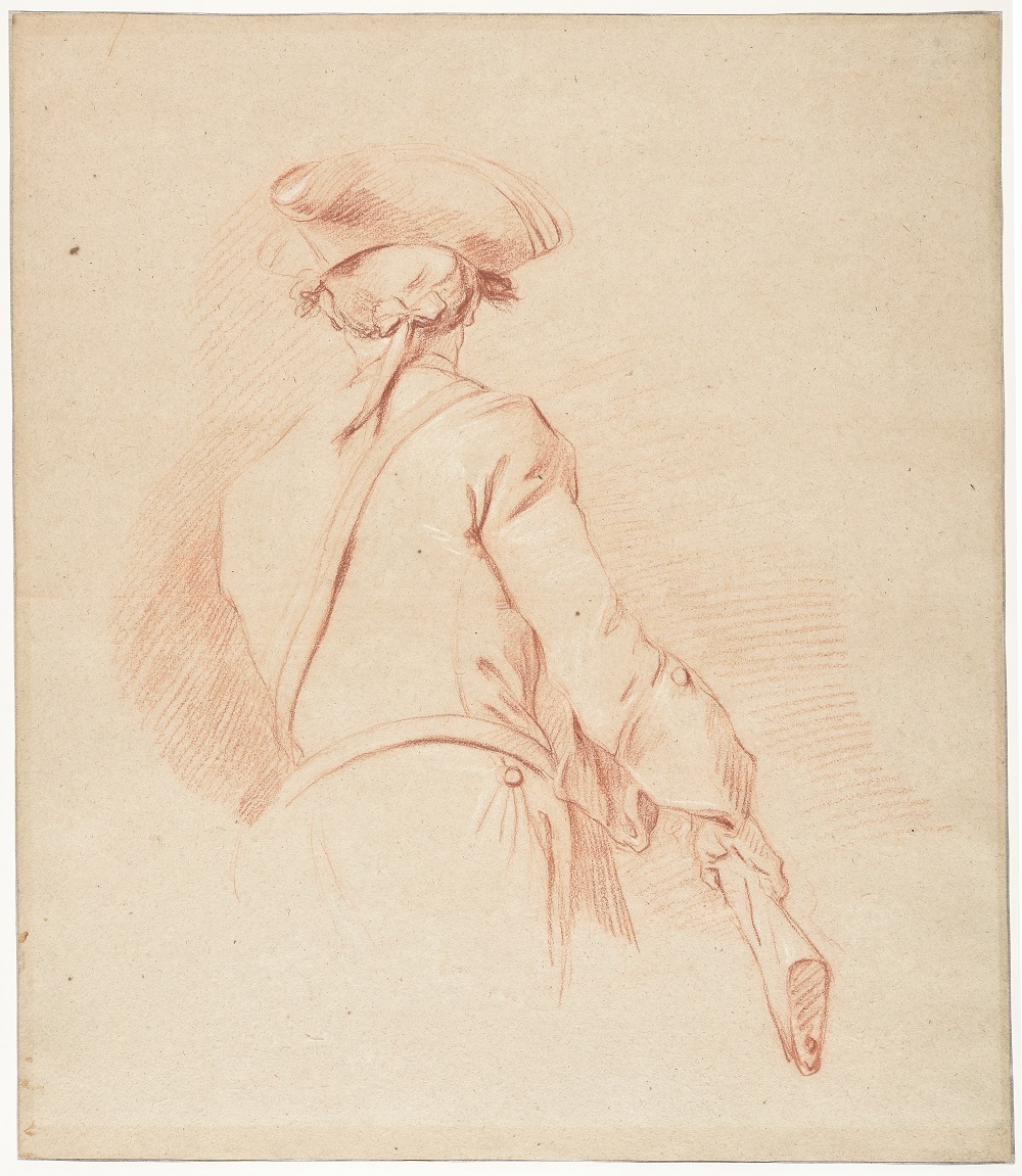 Notre dessin semble, de prime abord, appartenir à ce même groupe d’études, parfois prises sur le vif. Il s’agit d’un fantassin armé de son fusil, vu jusqu’à la taille et de dos, s’avançant dans un mouvement souple et très naturel. Son uniforme dépourvu d’ornements et l’absence d’une perruque trahissent sa condition de simple soldat. On imaginerait facilement cette figure dans l’une des scènes de bataille de Charles Parrocel, dans le feu de l’action, marchant avec son régiment d’infanterie contre un ennemi en nombre. De tels personnages vus de dos sont une constante dans l’œuvre de l’artiste, car ils permettaient d’accentuer la profondeur de l’espace en dirigeant les mouvements vers le lointain, plutôt que de masser les protagonistes au premier plan.