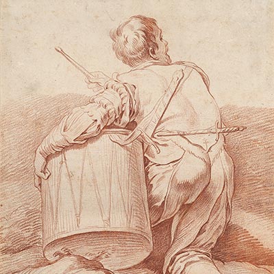 Toutefois, le rendu précis, le trait maîtrisé, les rehauts de blanc judicieusement disposés, la composition équilibrée et tout particulièrement le grand format de notre feuille font croire à un dessin achevé plutôt qu’à un croquis préliminaire ou une étude de figure, généralement plus petits. On peut rapprocher notre sanguine d’un Soldat assis tenant un verre réalisé aux trois crayons sur un papier de dimensions sensiblement semblables (40 x 26 cm, collection particulière).