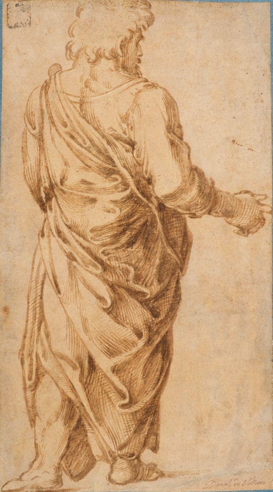Le nom de Saint Paul était également autrefois donné à notre dessin qui confirme la fascination qu’exerçait, et qu’exerce toujours, ce personnage monumental qui paraît incarner à lui seul l’inébranlabilité du dogme chrétien. La feuille fut réalisée peu après l’achèvement de la fresque par un artiste ayant certainement pu accéder aux appartements privés du pape pendant les travaux. De fait, il diffère bien trop de la gravure tirée de la Dispute par Giorgio Mantovano Ghisi en 1552 pour l’avoir utilisée. Son format, étonnamment grand, l’interdit également.