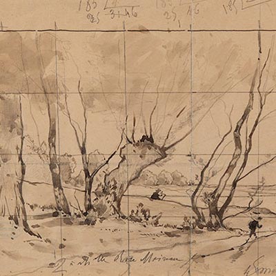 Par ailleurs, la nature, toujours présente dans les vues de Harpignies, est ici illustrée avec finesse d’une part, par le jeu sur les différentes nuances chromatiques de vert, et d’autre part, par la dépiction des arbres et des branches, traitées au lavis d’encre de Chine et animées d’une vie propre.