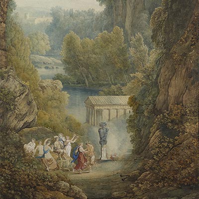 Depuis Paolo Panini (1691-1765) jusqu’à Hubert Robert (1733-1808), les ruines exercent un véritable effet de fascination sur les artistes en quête de puissance historique. Pourtant, Ducros ne cherche pas à copier le travail de ses aînés mais bien de s’en inspirer pour les intégrer à sa propre conception. Dans ses paysages documentaires, il livre progressivement une véritable ode à la nature. À l’aube du romantisme, elle reprend ses droits sur l’homme et envahit la majeure partie de ses compositions. Les ruines, quant à elles, expriment les nouvelles tendances esthétiques littéraires et la sensibilité de leurs auteurs tels que Edmund Burke (1729-1797) et le sublime ou William Gilpin (1724-1804) à travers le pittoresque. Ducros comprend cette sensibilité et la réinvente. Désormais son œuvre prend une nouvelle forme, l’Histoire passe au second plan. La seconde aquarelle présentée ici illustre cette conception. Retiré dans les hauteurs, l’artiste cherche des paysages jusque-là inexplorés par ses confrères, profitant de la prédominance végétale bien qu’interrompue ici à droite par la construction d’une villa.