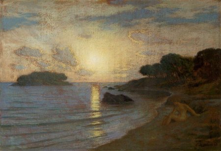 « Il a poussé plus loin que quiconque l’étude des heures crépusculaires », écrivit Lucien Simon lors de la rétrospective de l’œuvre de Ménard organisée l’année de sa mort à la galerie Charpentier. C’est à la tombée du jour que le peintre situe notre tableau, qui s’inscrit à la fois dans la lignée des paysages historiques de Poussin, et dans la veine monumentale de Puvis de Chavannes.