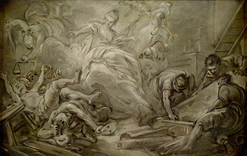 La touche rapide de cette esquisse est énergique, mais le sujet reste difficile à interpréter : la Vérité, à coté de son miroir, et la Justice avec sa balance et son glaive, dominent la composition. Jeté à terre, on peut reconnaître le Mensonge, son masque à la main, ainsi que l’Ignorance avec les yeux bandés. Dans la partie droite, une autre scène demeure complexe : les personnages déroulent une toile ou un dessin. Pourrait-on y voir une allégorie de la Peinture protégée par la Justice et la Vérité ?