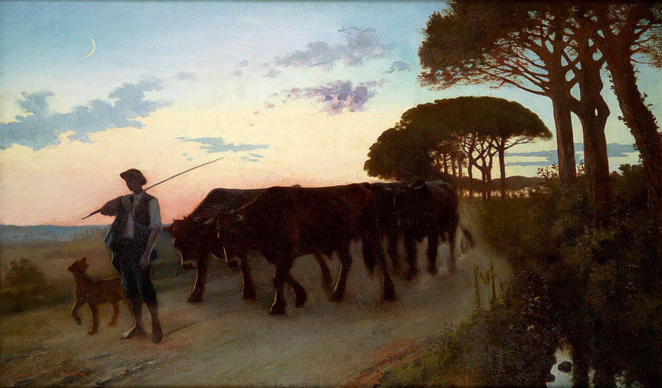 Notre magnifique tableau, probablement exposé au salon de 1896 sous le titre « Le départ du laboureur », sous le n°1149, étonne par son très grand format et son mélange des genres. D’un sujet très réaliste, le départ aux champs du paysan au petit matin, l’artiste imagine un tableau quasi symboliste. Les silhouettes sombres des arbres et de l’attelage se découpent sur un ciel rougeoyant, insufflant à la composition une atmosphère poétique et mystérieuse, dans la suite de Jean-François Millet (1814-1875).