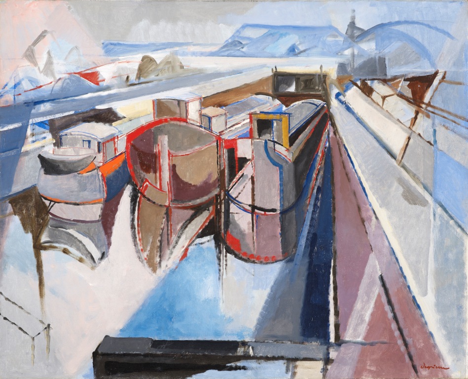 Notre tableau représente trois péniches sur la Seine, dans une écluse dont les portes sont en train de s’ouvrir, au tout premier plan. La composition est très construite, fruit d’un solide travail : « Ce qui me passionne, c’est de sentir profondément, au bout de mon crayon ou de ma plume, l’espèce de squelette du paysage, qui ensuite permet d’accrocher les muscles et la couleur », confiait Despierre.