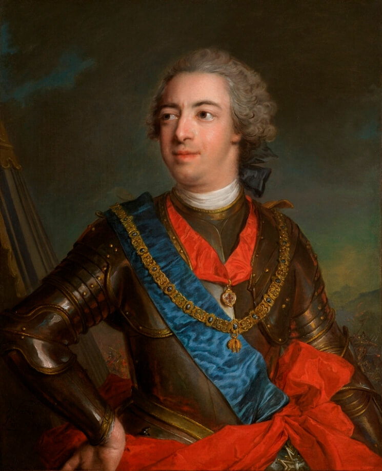 Mais l’artiste ne se contenta pas de reproduire une composition existante, même si la mise en scène choisie – le modèle vu en buste, vêtu d’une armure complète et tête nue, sur fond de bataille – était relativement courante dans son œuvre à partir surtout du portrait très célèbre qu’il fit de Pierre le Grand de Russie en 1717, représenté de profil à gauche, la tête tournée vers le spectateur (Munich, musée de la Résidence, ill. 4). L’artiste l’employa telle quelle pour les représentations du duc de Chartres (collection particulière), de Louis-Joseph de Bourbon (Dijon, musée des Beaux-Arts), du duc de Penthièvre (collection particulière) ou du Dauphin (Versailles), et la modifia quelque peu pour Louis XV, Pierre-Joseph Victor de Besenval (copies à l’Ermitage, ill. 5) ou le prince inconnu (copie à Birmingham Museum of Art, ill. 6). Dans le portrait du duc de Huescar, Nattier opta pour un ordonnancement différent, montrant son modèle presque de face, la main droite crânement appuyée sur la hanche, le visage fortement tourné à gauche et le regard dirigé hors du cadre. Un sourire semble effleurer ses lèvres, impensable dans les autres portraits d’hommes en armure avec leurs figures impassibles et affectées.