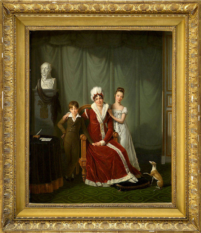 Il s’agit du portrait de famille d’un comte d’Empire auquel Lagrenée confère donc une dimension solennelle portée par un grand sens de la mise en scène : la pose des personnages, le buste du Général, le détail du chien...