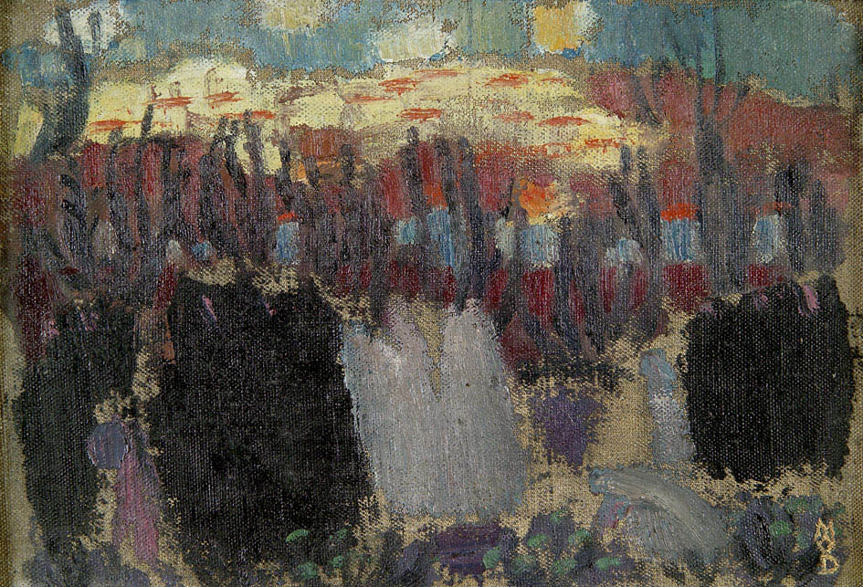 La ‘Procession aux toits rouges’ est peinte vers 1892, au cœur de la période nabi de l’artiste. La palette chromatique en est caractéristique ; la manière évoque la leçon de Gauguin à Sérusier pour ‘le Talisman’. Dans un format réduit, Maurice Denis juxtapose des blancs, bleus verts et rouges francs, laissant affleurer la toile non préparée. II dispose dans le décor ainsi brossé les touches noires et gris teinté de mauve des personnages. L’ensemble ne peut qu’évoquer la formule désormais célèbre du jeune nabi, qui semble résumer avec bonheur les solutions esthétiques de notre toile : « Se rappeler qu’un tableau, avant d’être un cheval de bataille, une femme nue ou une quelconque anecdote, est essentiellement une surface plane recouverte de couleurs en un certain ordre assemblées. »