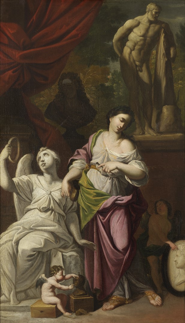 Enfin, la Sculpture, la tête laurée et drapée de pourpre et vert-jaune, œuvre à un marbre représentant la Renommée. Sur le rebord du mur qui sépare la pièce, semblable à celle de l’Architecture, d’un parc planté d’arbres, sont posés l’Hercule Farnèse et un buste qui semble être celui du duc Charles V d’après le portrait réalisé par Guillaume Wissing (1655-1687) et largement diffusé grâce à la gravure de Jacob Gole. En bas, un petit putti parachève une tête en argile, alors qu’un génie nu montre à la Sculpture le médaillon d’un homme non identifié et qui pourrait être le commanditaire de l’ensemble. Procédé fréquent chez Charles, le génie est plongé dans une sorte de demi-teinte rouge, semblable au reflet d’un foyer, afin de mieux faire ressortir la fraîcheur des carnations de la jeune femme.